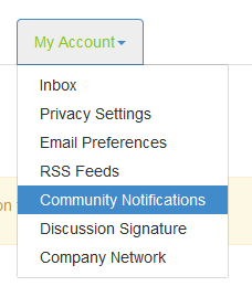 Once you are a member of some communities, you will want to set your subscriptions. To access your Subscriptions, navigate to your Profile, select My Account and Community Notifications.