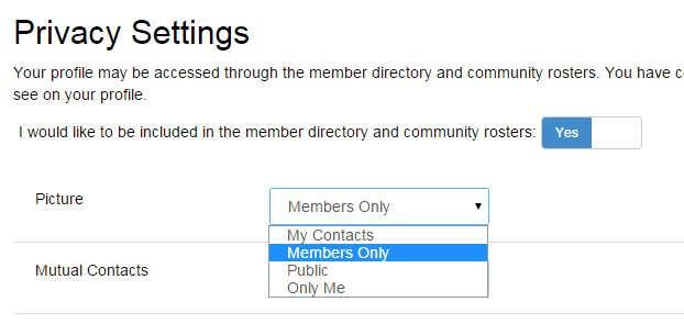 Select from My Contacts, Members Only, Public, or Only Me for each item on your profile and then click save.